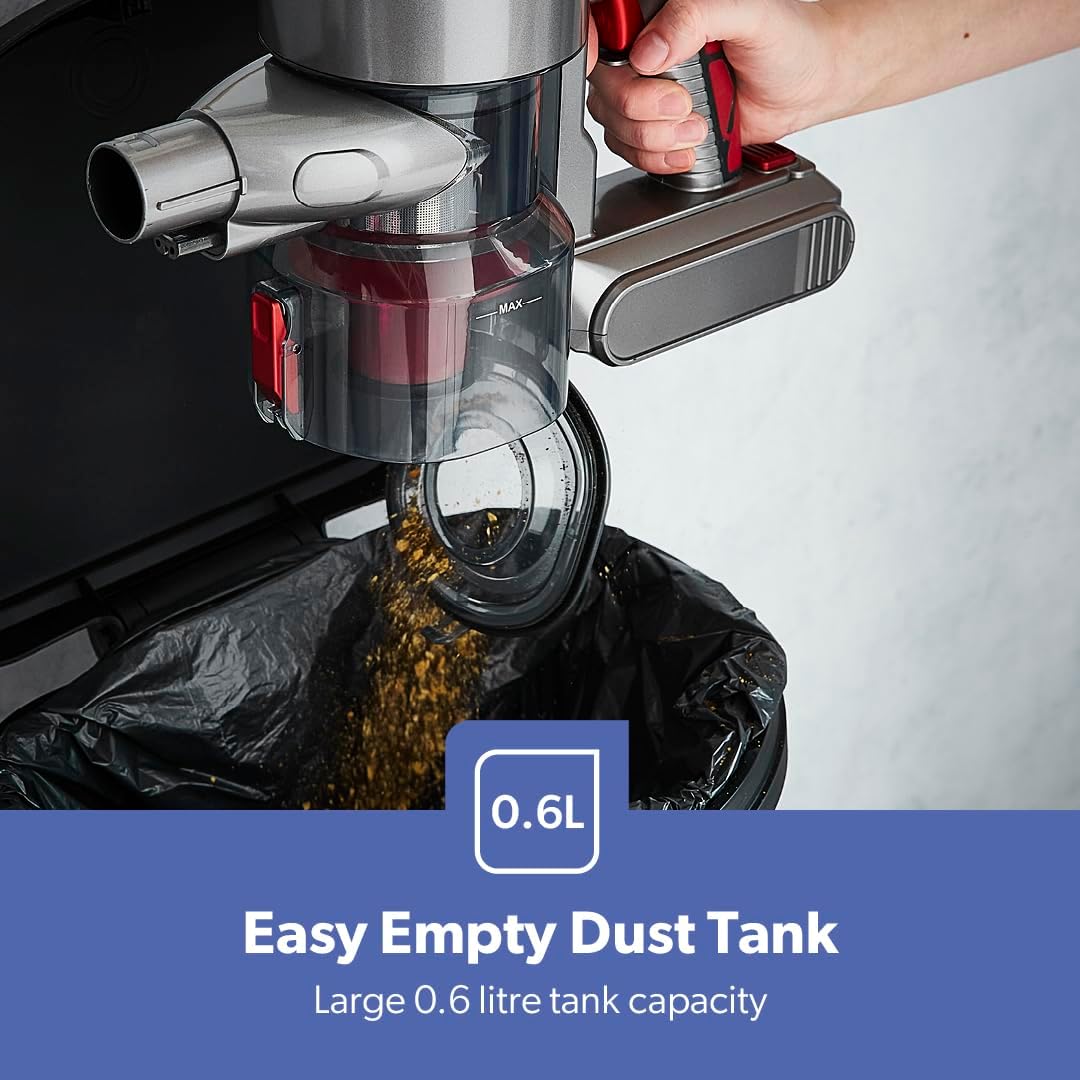 Switch seamlessly between stick and handheld modes to tackle a variety of cleaning jobs across your home. Use the lightweight stick mode to clean large floor areas, and switch to the handheld mode for tight spaces, upholstery, stairs, and car interiors. The transparent 0.6L dust tank lets you easily monitor and empty dust without interruptions.